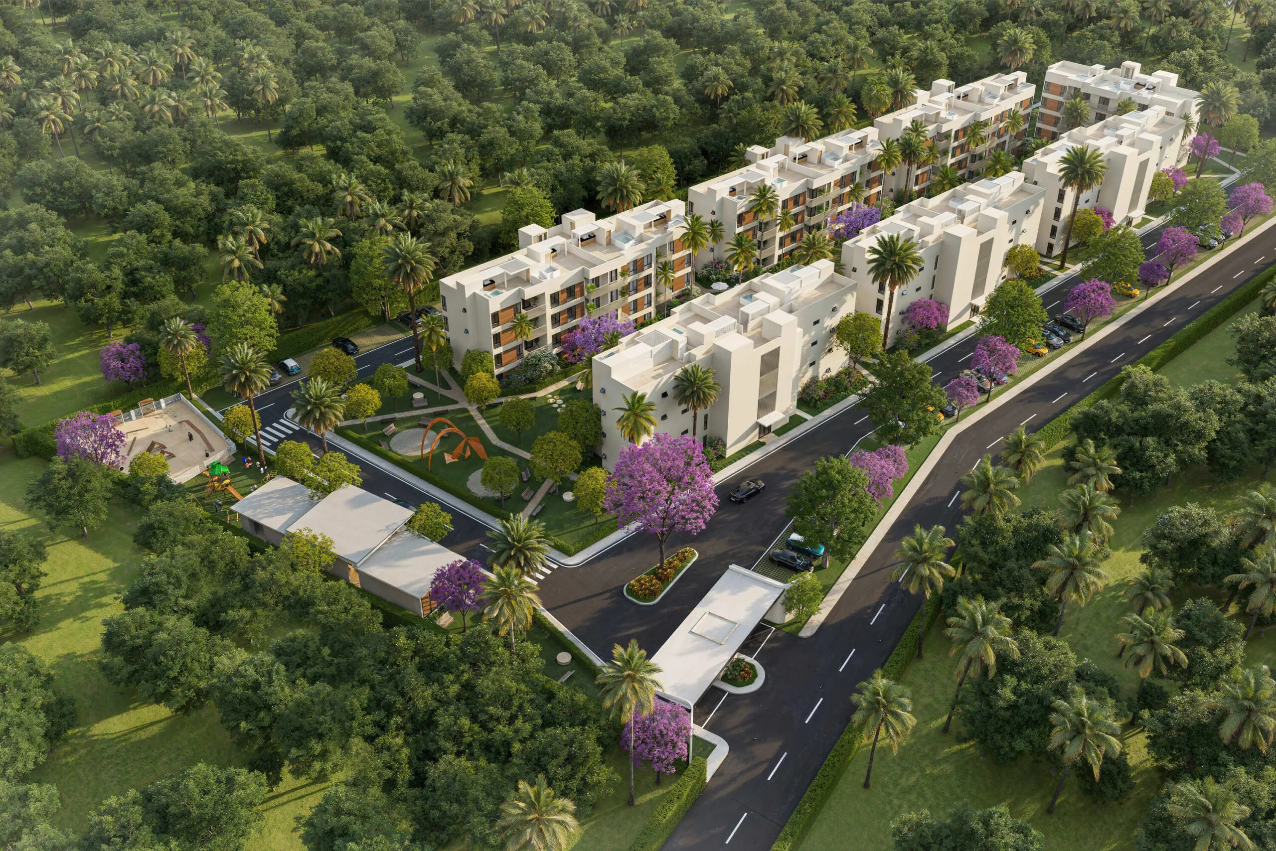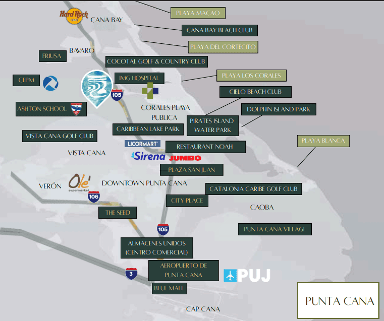 Located on the Circunvalación Verón–Bávaro, 1.5 km from the Boulevard Turístico del Este, Terra Serena offers direct access to the main urban flows of the destination without sacrificing the tranquility of a residential environment.